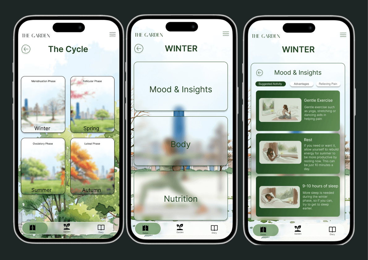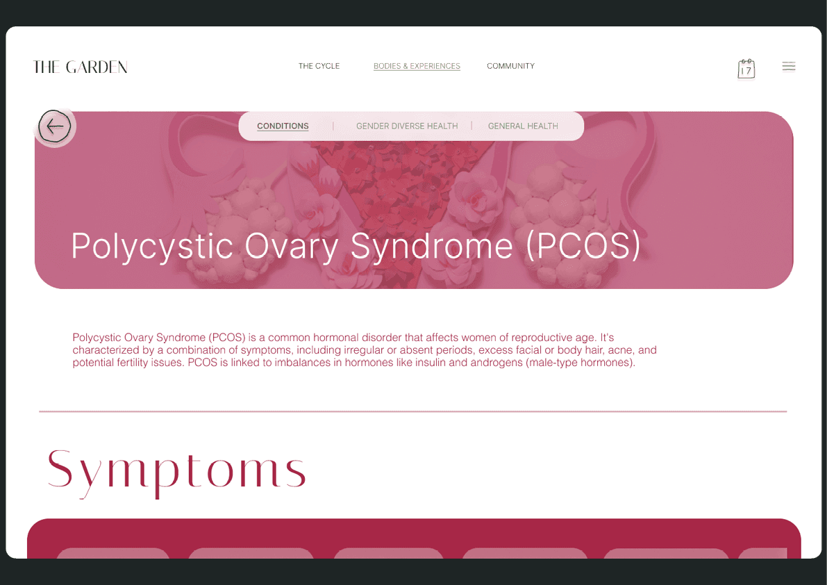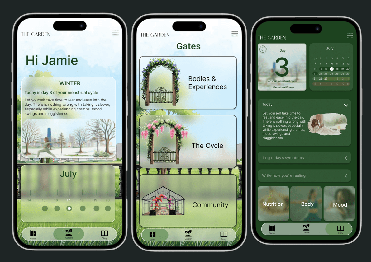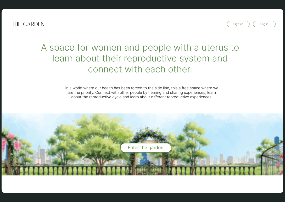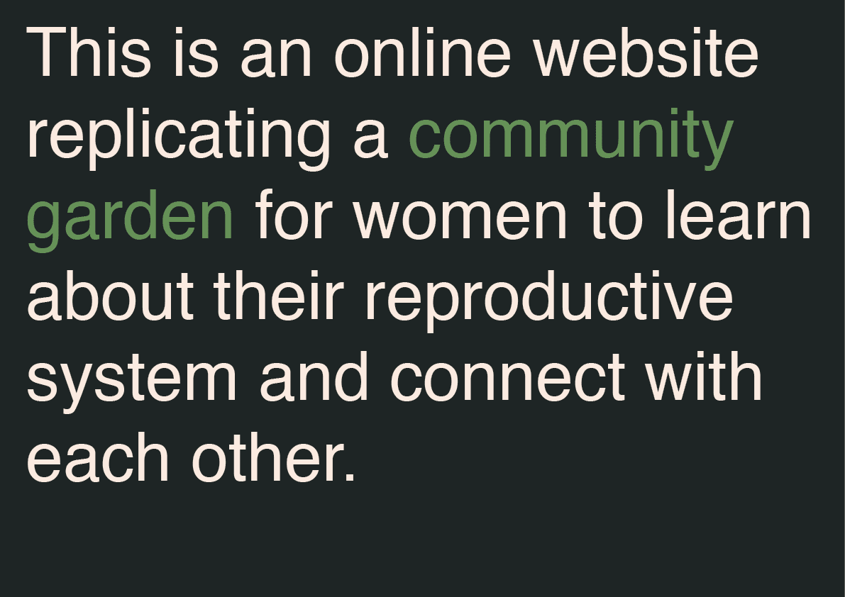 ‘The Garden’ was born out of acknowledgement of a long history of inequity in women’s reproductive health. My own observations about my personal experiences with late diagnosis in reproductive issues, along with hearing all of my female friends’ tales, flagged concern in the structures and nature of women’s reproductive health in Australia, and further research validated the extreme inequity in this area. I developed an accessable website for young women in Australia to learn about their reproductive in a communal, engaging and concise manner.