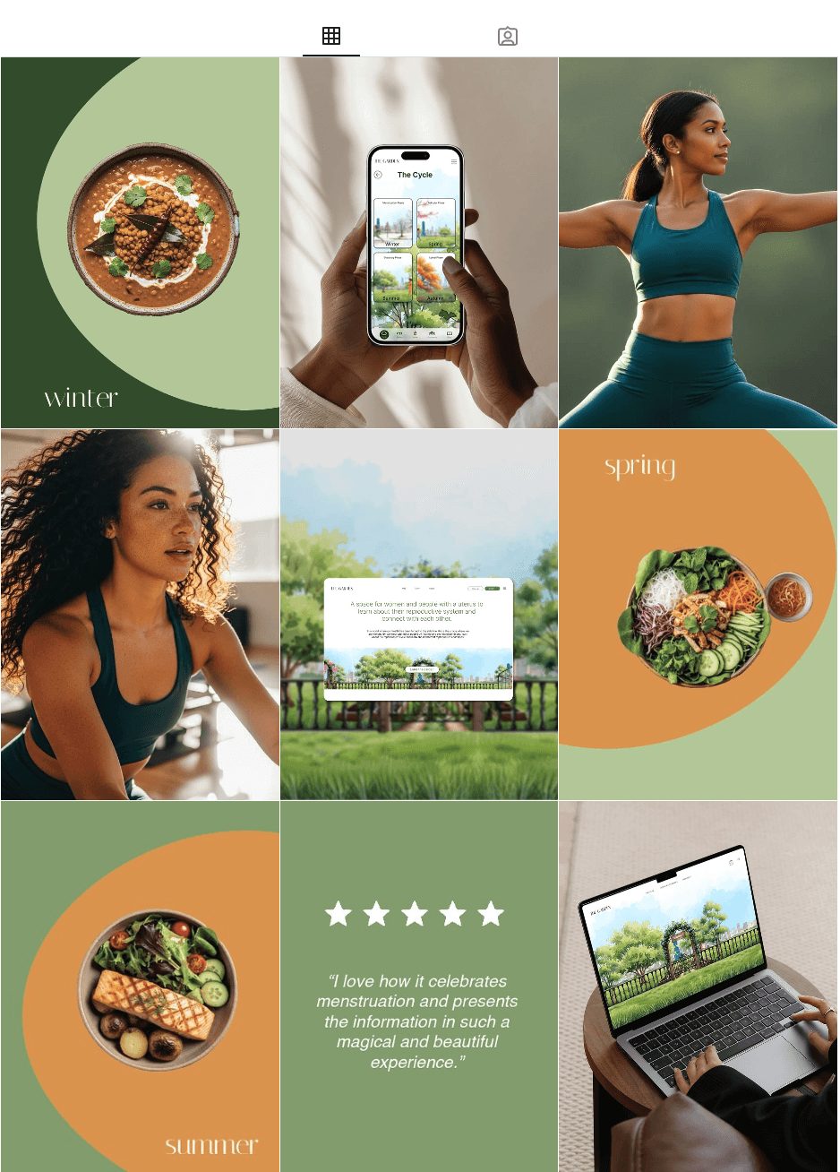 I decided an Instagram social media account is the fast way to gain an audience. The layout of the Instagram feed is a random mixture of different types of posts with information about women’s bodies, testimonials and website/app promotion. The same colours and font are repeated for a distinct brand identity that aligns with health, empowerment and digital efficiency.