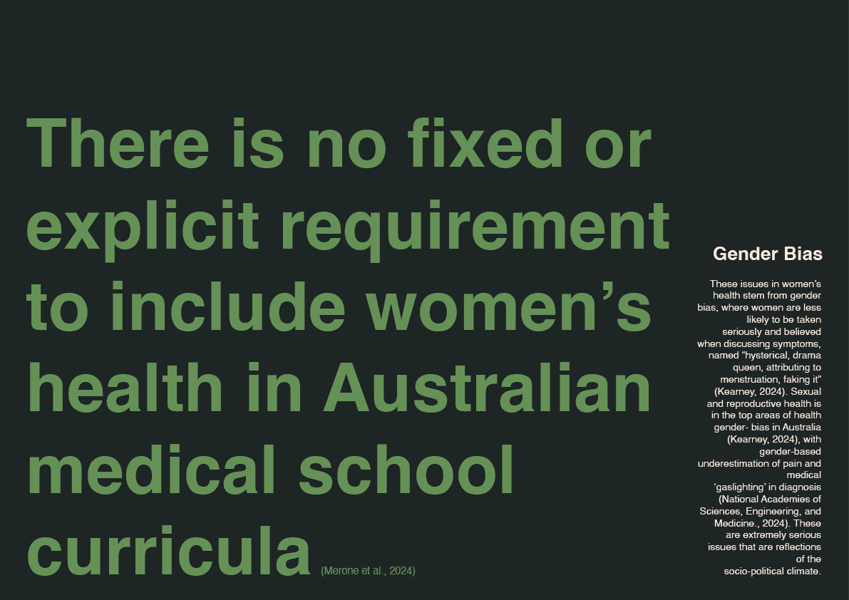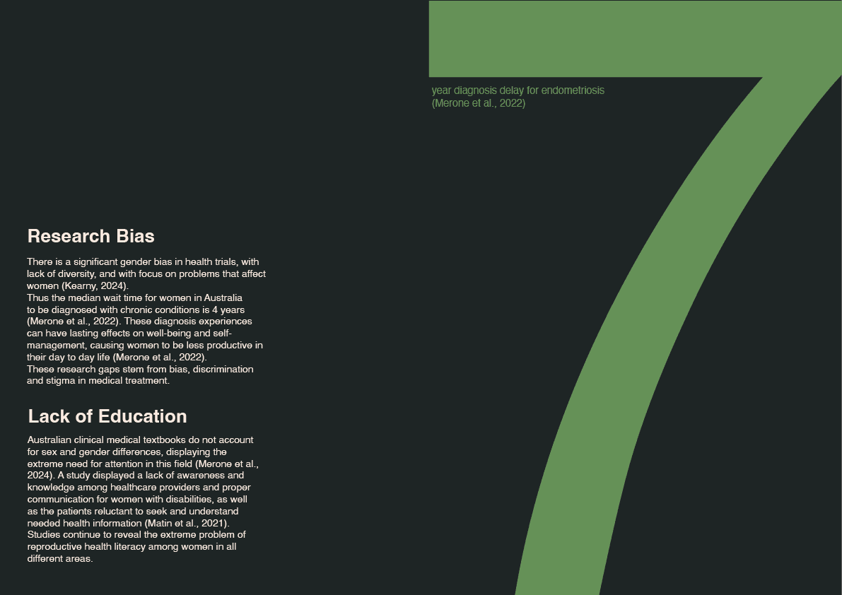 Women's reproductive health has been severely under-researched, under-educated and disregarded, which means that most women barely understand their own bodies and many conditions are left under/misdiagnosed, and this leads to concerning statistics, such as over 70% of women in Australia reporting bias in diagnosis and treatments.
