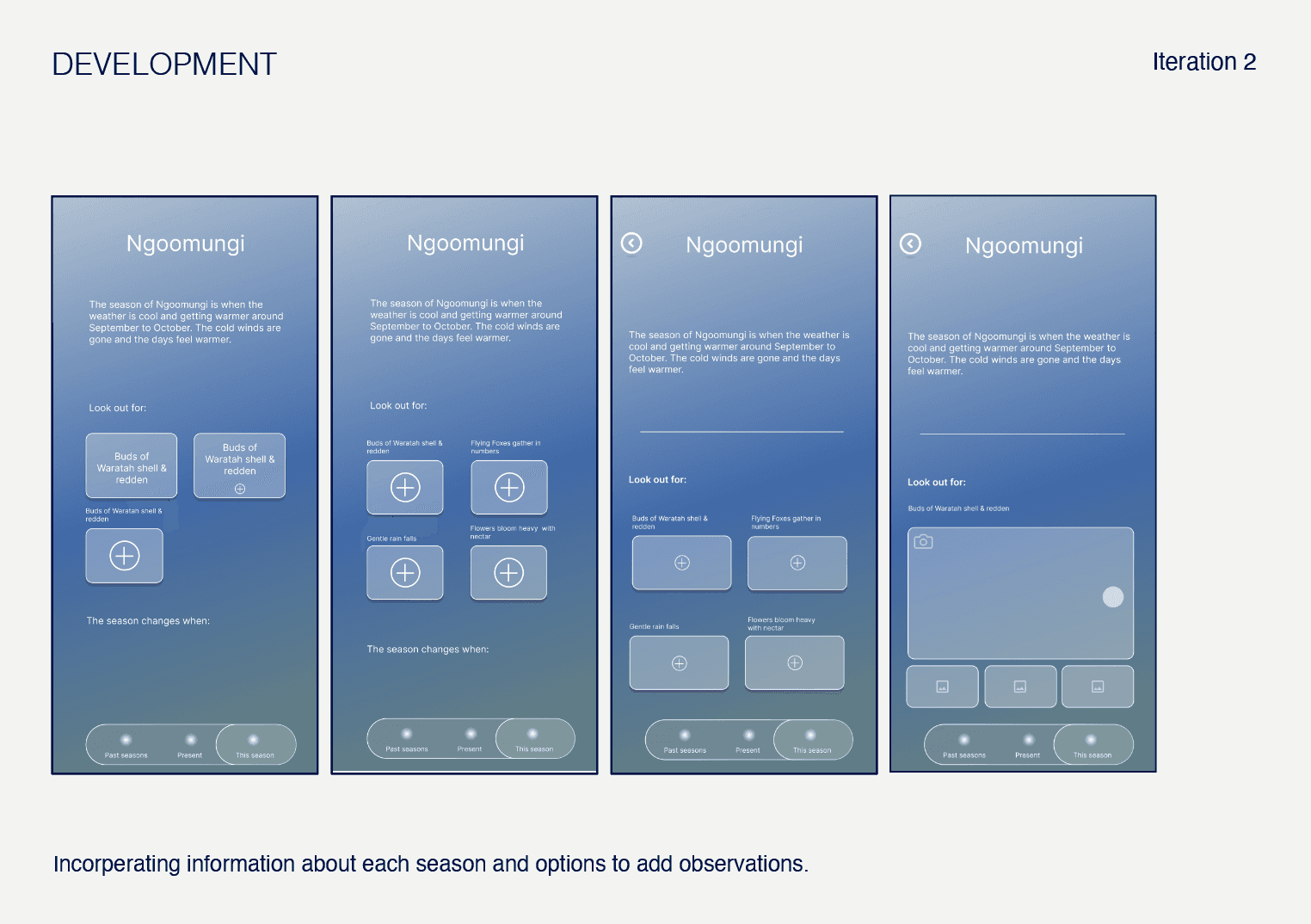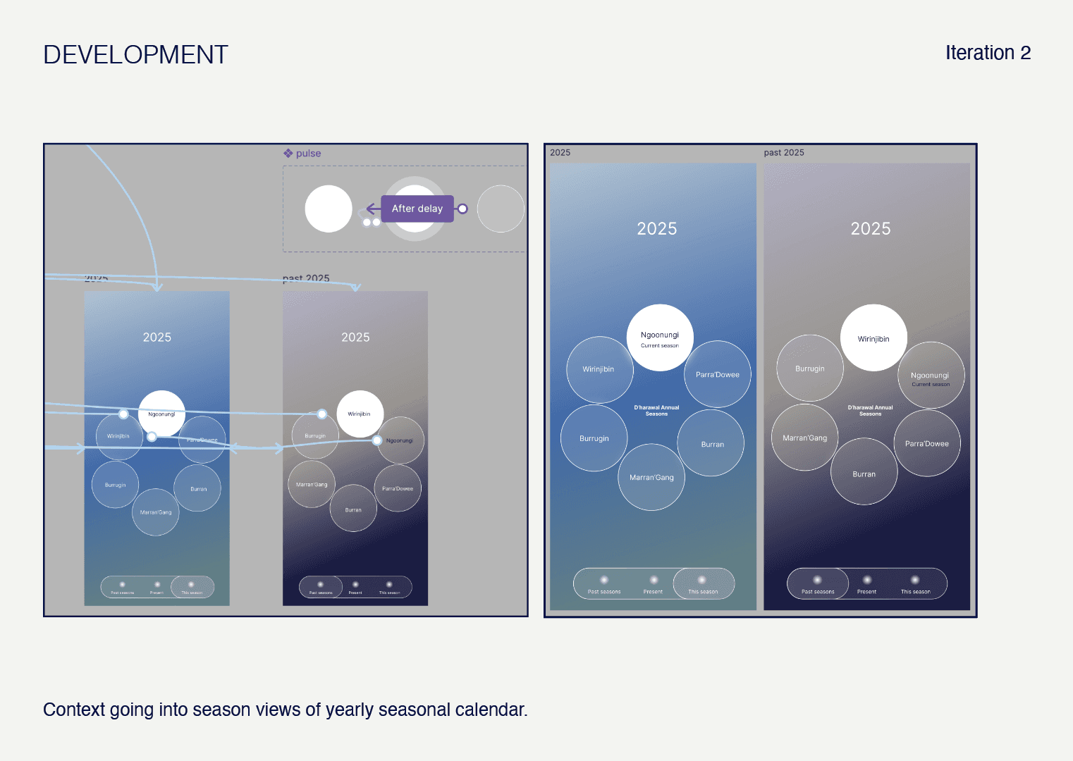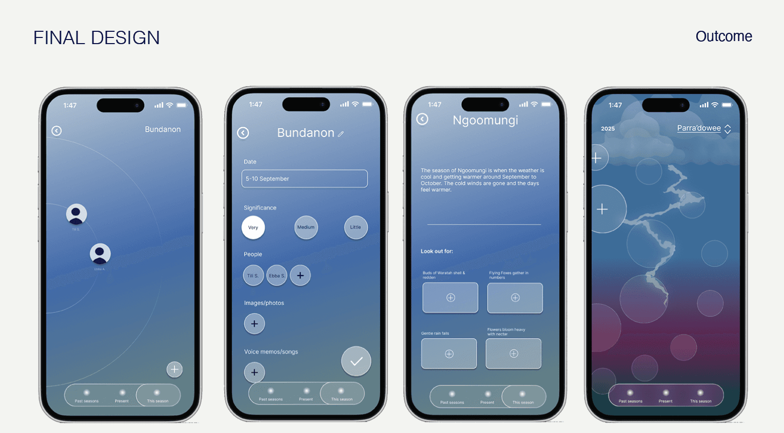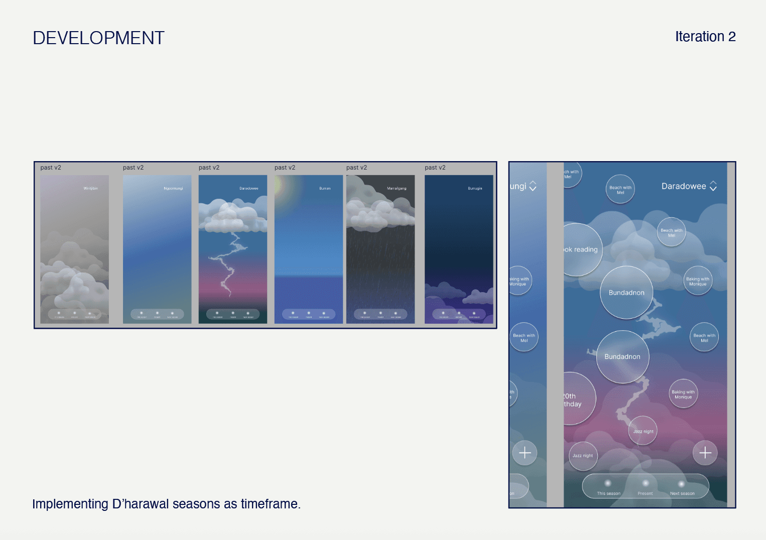 The Indigenous theory Dadirri, or ‘Deep Listening’, also influenced the layout of the calendar, to a more fluid, community based and interconnected perception towards events that pass, enabling reflection and revisiting, as well as encouraging the user to be aware of the environmental factors surrounding them that to observe when the seasons are changing.