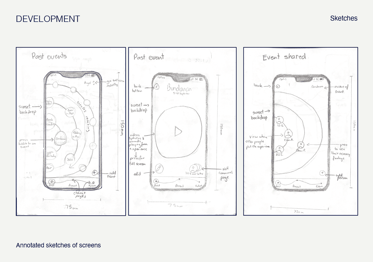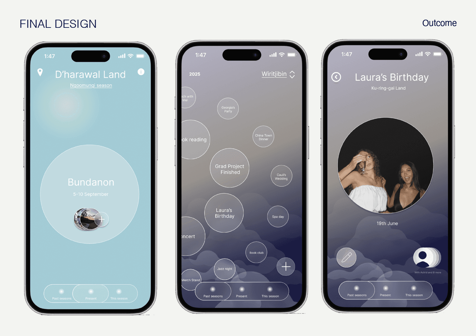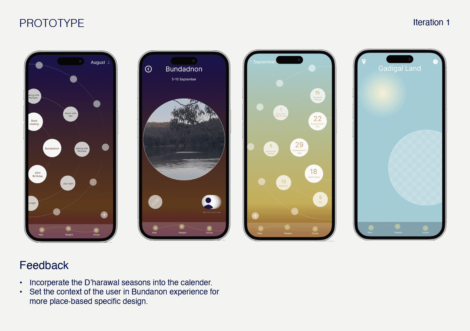 Researching First Nations perspectives on time, I found ‘Time Circles’, which is an Indigenous theory emphasising how the past, present and future are intertwined, with the past living within us, prompted and revisited through art. Time circles centers the individual and focuses on significant events feeling closer in time. This perspective inspired the visual layout of the Calendar.