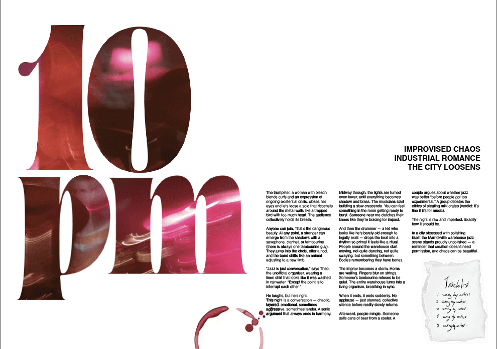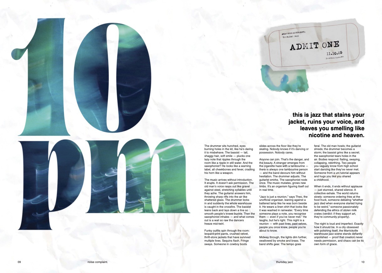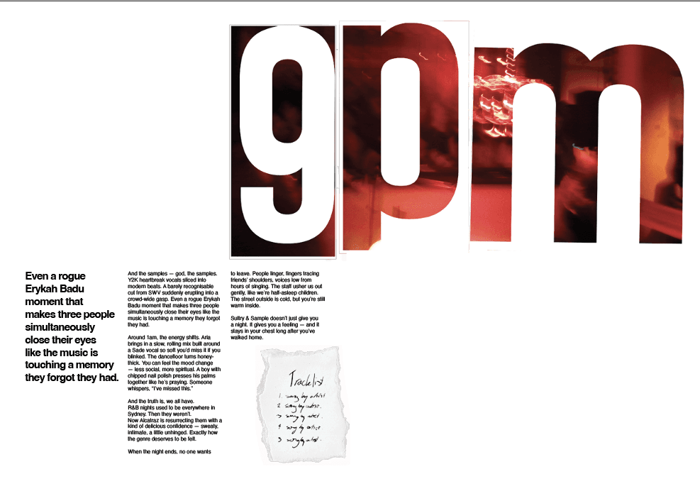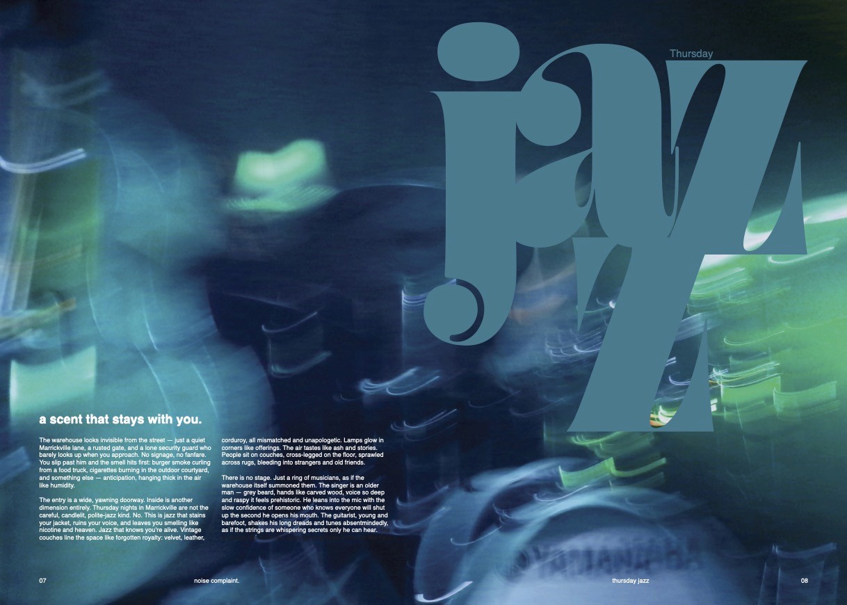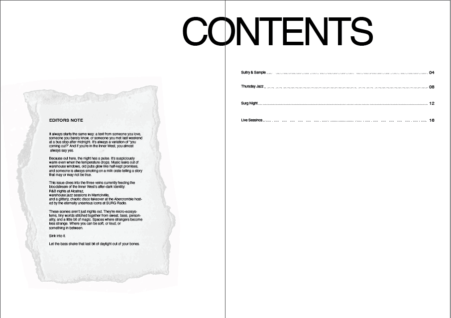 With an open brief, this magazine was designed to highlight the vibrant night life in the inner west and explore the different events and music styles on offer. Each article takes place at a different venue.